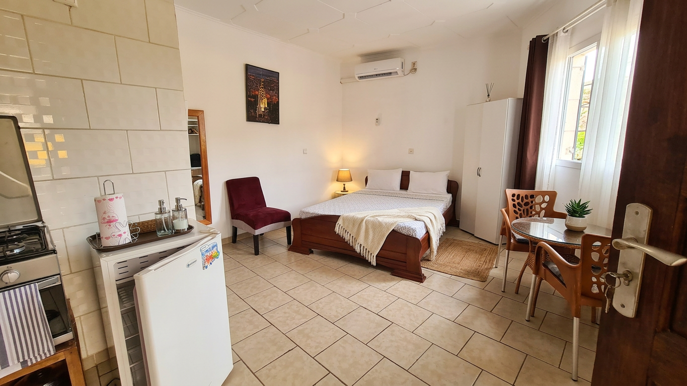 Cette chambre moderne et spacieuse a été conçue pour maximiser l'espace et le confort. L'aménagement intelligent permet de disposer de tous les équipements essentiels : coin nuit confortable, kitchenette fonctionnelle, espace repas et de travail et salle d'eau. Elle donne vue sur la rue principale.